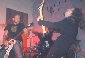 dass CFE zum Beginn ihrer Tour mitmuckten. Hamburg am Abend. Nach einer kleinen Odyssee standen wir vor der SCANDIA-BAR...und die war inmitten von St.Pauli. Überall blinkte irgendwas, jeder wollte dir seine getragenen Buchsen verkaufen, Nutten, Zuhälter, Casinos, und der ganze Ruß. Keiner von uns war jemals dort gewesen, aber nach einem späteren "Rundgang" war auch keiner mehr so scharf darauf, wieder herzukommen. Die SCANDIA-BAR ist bekannt dafür, dass besonders skandinavische Bands ohne zu zucken einen Mucke dort bekommen. Anruf genügt. So in etwa. Auch die Betreiber der Bar sind Finnen. Doch um die Werbung scheint sich kaum jemand zu kümmern. Vier zahlende Gäste bei zwei Euro Eintritt... Jedenfalls gab's dann ohne Limit Drinks. Das beruhigte. Doch CAUSE FOR EFFECT waren nervös. Schließlich der erste Gig der Tour, wobei ich hier noch erwähnen muss, dass sich die beiden wie die Schneekönige über jeden kleinen Erfolg freuen, obwohl sie schon zum dritten Mal durch Europa gondelten und in heimischen Hemisphären mit Bands wie ENTOMBED, NAPALM DEATH oder NASUM spielten und einige dieser Mucker zu den Fans des Duos zu zählen sind, insbesondere ENTOMBED. Die Show begann gegen zehn. Kaum Leute. Ich sah die Finnen hier das erste Mal, kannte ich doch bisher auch nur die Konserven, die schon recht strange anmuteten. Doch was war das? "We are CAUSE FOR EFFECT from Finland and we play Finnish NuMetal." What the hell these guys are doing there? Bass clean, Geröchel und dazu Schlagzeug, eine abgefahrene Kombination von Jazz, einigen funkigen Elementen, Grind und ähm... Keine Ahnung, es war wirr und doch mit Konstrukt. Verfrickelte Basslinien, kaum Akkorde, im Vordergrund, dazu ein Schlagzeuggebastel sondergleichen. Das Ohr verwirrt, das Auge gleichfalls, unentschlossen, wem es die Beobachtung schenken sollte, ob Ari hinter den Drums, dessen wildes und gestenreiches Gebaren man nicht mehr einfach nur als humoristisch abtun konnte, oder Tuomo am Bass, dessen Bewegungsradius eher gering war, der aber durch sein trockenes, gleichfalls grimassenreiches Erscheinungsbild sehr an typical british behaviour erinnerte. Dreißig Songs innerhalb von 25 Minuten. Und kein bisschen langweilig. Wie muss diese Mixtur aber auf Leute wirken, die völlig unvorbereitet und ahnungslos eine CFE-Show besuchen? Wir werden es noch erfahren. (Tuomo