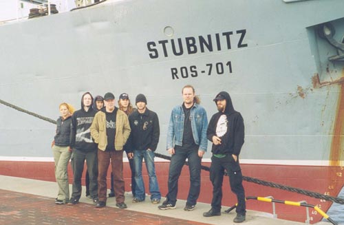 Wer die STUBNITZ kennt, weiß, was Phase ist. Wer nicht, muss sich zwangsweise überraschen lassen. Ein ausgedientes Frachtschiff, dass einzig und allein dazu dient, die Kultur durch die Lande zu fahren, mal dieser, mal jener Hafen, hauptsächlich aber Rostock. Der Laderaum enthält genügend Platz für Bühne und Publikum, in wahrhaft schrägem Ambiente. Übernachtung und Backstage logischerweise in den Kajüten. Die Show heute wurde landesweit beworben, 120 Metaller folgten der Einladung. Alles verlief nach Plan. Soundcheck aufwendiger als sonst. Spielreihenfolge mit den Bands geklärt. Es konnte vor zehn losgehen, mit WEYLAND, den lokalen Metallern, die sich hauptsächlich dem DeathMetal hingeben, einige schwarzmetallische Einschübe zu vermelden haben und auch ein gewisses Maß an Atmosphärik nicht vermissen lassen. Gute Musiker, doch schon oftmals gehörte Musik. Gekrönt wurde der Gig durch ein AT THE GATES-Cover ("blinded by fear"), wobei man sich mühte, das Original wiederzugeben. Na ja. Nee. Den Metallern hat der Gig gefallen. GORILLA MONSOON mussten sich auch erst mal den Arsch abspielen, bevor der Funken auf die wachsende Besucherzahl übergriff. Das dauerte 'ne Weile, doch er kam, der Funke. Ich saß derweil verloren hinter meinen zu vertickenden Scheibchen und sah eine eingeschworene Metaller-Gemeinde in oftmals bluttriefenden Shirts an mir vorbeiwandern. Nach dem Gig änderte sich das, die Nachfrage wuchs. Und als erst einmal CFE wieder ihren Standard-Überraschungseffekt hinter sich hatten, konnte ich mich wegen mangelndem Umsatzes nicht mehr beschweren. Für beide Bands ein sehr guter Auftritt, ich wage zu behaupten, der beste auf der ganzen Tour. Als Schlusslicht und Headliner GOLEM. Die deutschen CARCASS-Erben aus dem Berliner Umland, technisch versierte Musiker, fahren ihren Stiefel präzise, wenn auch ein Gig auf Dauer in seiner ganzen Länge recht monoton wird. Zu allem Unglück riss dem Bassisten Rainer (auch bei den PROGERIAnern tätig), die H-Seite, kein Ersatz in Sicht, so ein kompletter Set ohne Bass, was den Auftritt schon stark schmälerte. Übrigens steht in Bälde ein neues Album an. Ein geiler Abend, der nur durch die arrogante Bedienung hinter dem Tresen geschmälert wurde, die die Bands wie Dreck behandelte. Es gab drei Getränkemarken pro Nase, aber nicht etwa irgendwas, sondern anfangs 0.4er, später nur noch 0.3er Bier oder noch weniger, das Maximum an Alkohol. Ausgeschenkt wurde aber normal in halben Litern. Fragte man da mal nach, warum, erhielt man nur noch 'ne dämliche Antwort. Was glaubt Ihr denn, warum die Leute zu Euch kommen und Eure Brühe saufen wollen? Doch nicht etwa wegen Euch. Na ja, egal, irgendwann hat's dann doch wieder "kling" gemacht, und die Feinmotorik fiel bei der kompletten Besatzung aus...